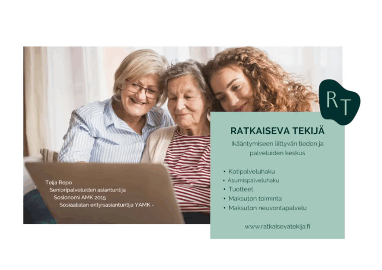 Ikääntyminen tuo mukanaan monenlaisia kysymyksiä, päätöksiä ja tarpeita – mutta tärkeä tieto ja apu ovat usein hajallaan. Ratkaiseva Tekijä kokoaa kaiken olennaisen yhteen paikkaan: tiedon, palvelut ja tuen, joita tarvitset joko itse tai läheistesi hyväksi. Palvelumme ovat maksuttomia ja helposti käytettävissä koko Suomessa. Meiltä löydät kotiin vietävät palvelut, asumisvaihtoehdot, luotettavan tietopankin, maksuttoman neuvonnan ja arkea helpottavia tuotteita – kaikki ymmärrettävässä muodossa ja yhdestä paikasta.